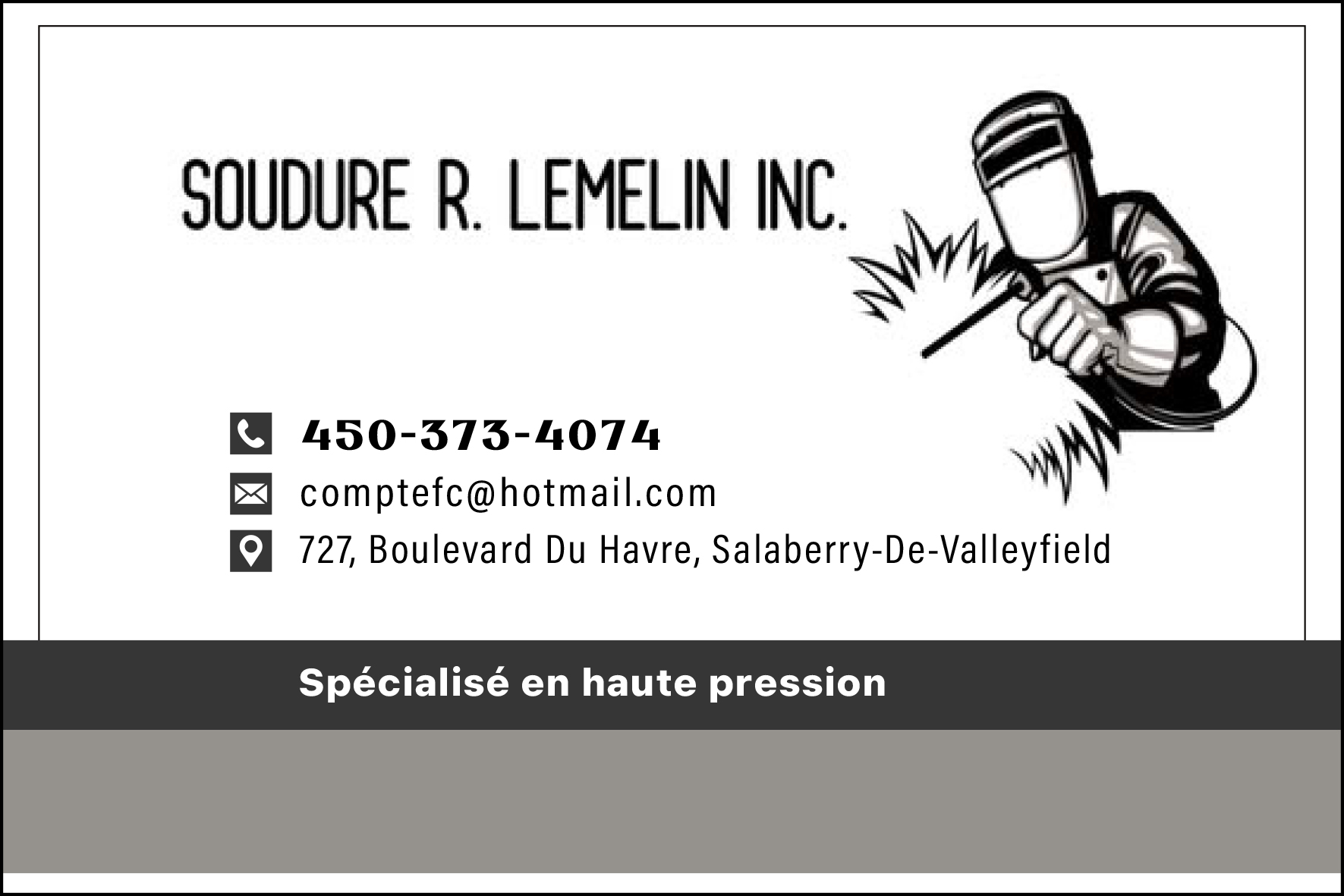 | Mots clés | Soudure Réparation Résidentiel Commercial Industriel Fabrication Soudeur Soudure haute pression |