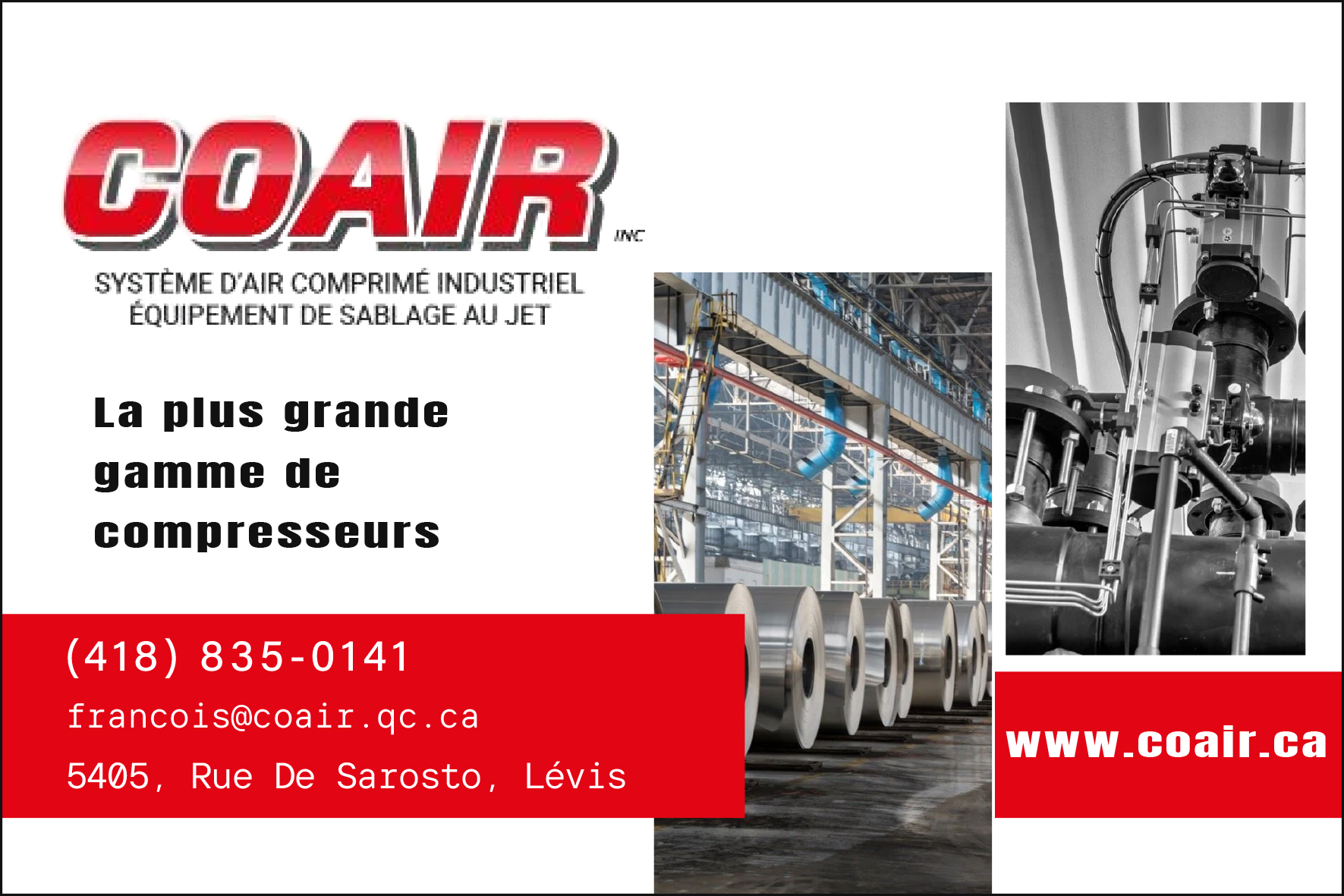 Services | La plus grande gamme de compresseurs. Coair vous offre la plus grande gamme de compresseurs de 5 à 500 HP, exempts d’huile ou lubrifiés, que ce soit des compresseurs à piston, à vis, scroll, électriques, au gaz ou diesel. Le plus gros inventaire dans l’est du Québec.Notre mission est de vous servir en vous fournissant des équipements à la fine pointe de la technologie, en vous prodiguant des conseils adaptés à votre environnement et en vous accompagnant pour l’installation et le service de maintenance. L’équipe de COAIR répond à vos questions et vous guide dans votre expérience d’achat afin de vous aider à faire le meilleur choix pour votre production d’air comprimé. |