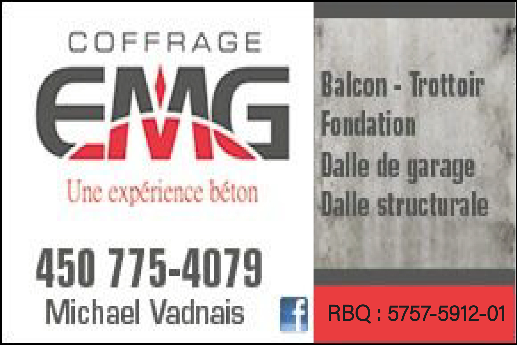 | Services | COFFRAGE EMG INC est une entreprise spécialisée en coffrage, offrant des services complets pour les secteurs résidentiel et commercial. Elle réalise des travaux de coffrage de fondations, de dalles de garage, de balcons ainsi que de trottoirs, en assurant une exécution précise, durable et conforme aux normes de construction en vigueur. |