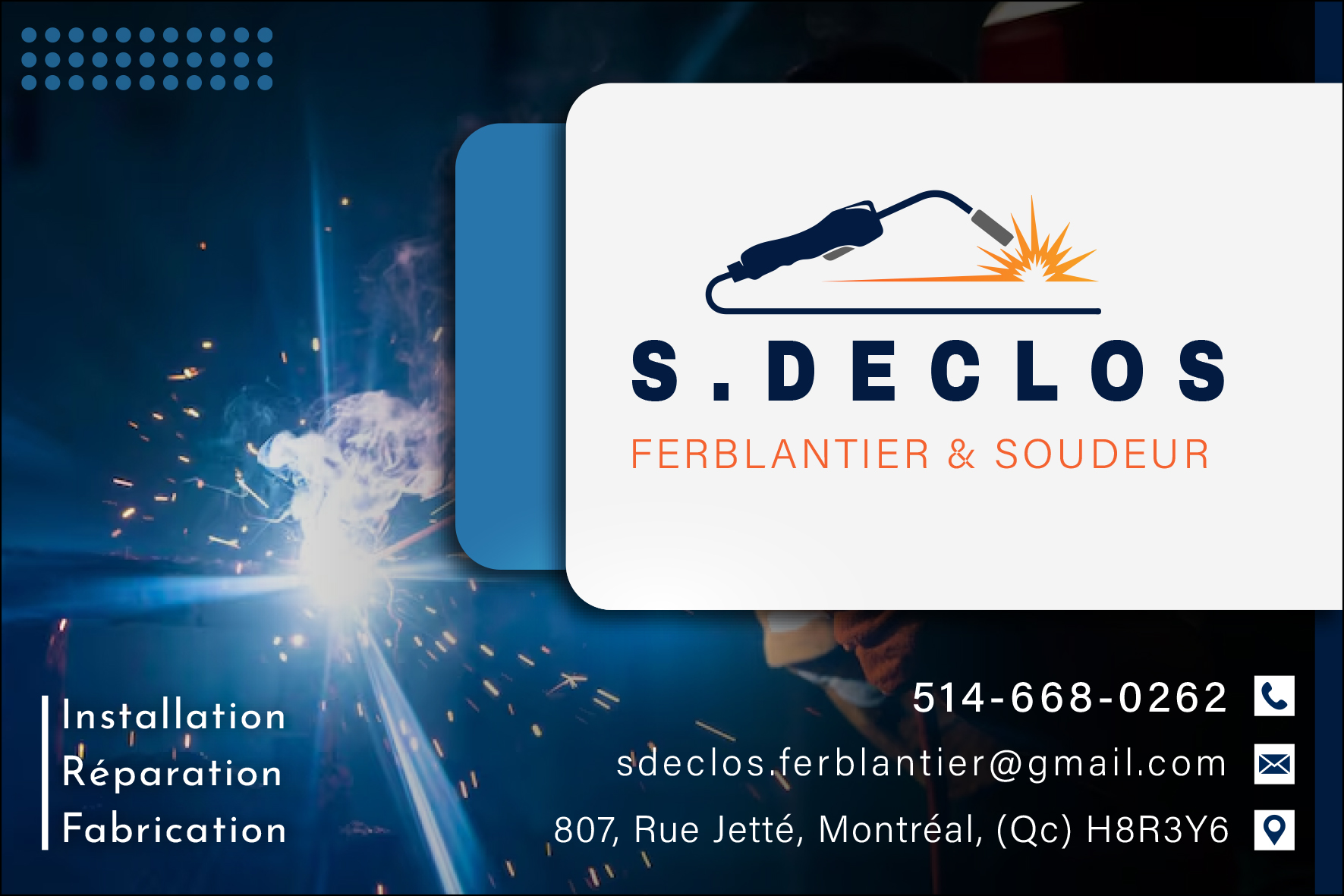 | Services | S. DECLOS FERBLANTIER & SOUDEUR INC est une entreprise spécialisée en ferblanterie et en soudure, offrant des services professionnels dans la fabrication, l’installation et la réparation de pièces métalliques. Elle intervient notamment dans la conception de systèmes de ventilation, la transformation de tôle, ainsi que divers travaux de soudure adaptés aux besoins résidentiels, commerciaux et industriels. Grâce à son expertise, l’entreprise assure des réalisations durables et sur mesure, répondant aux exigences de qualité et de précision. |
