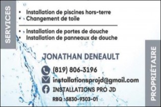 | Services | L’entreprise INSTALLATIONS PRO-JD INC se spécialise dans une large gamme de services liés à l’installation et à l’entretien, tant dans les secteurs résidentiel que commercial. Elle offre notamment l’installation de piscines neuves ou usagées, le changement de toile, ainsi que l’installation de piscines hors terre. L’entreprise propose également des services de remise à niveau, de démontage et de transport, ainsi que des solutions de filtration. En plus de ces prestations, elle réalise l’installation de portes de douche et de panneaux de douche, garantissant un service complet et professionnel adapté aux besoins de sa clientèle. |