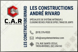 | Services | Fondée en 2003 par M. André Rivard, l’entreprise « les constructions André Rivard Inc. » se spécialise dans le système intérieur, plus précisément, ils effectuent la pose de gypse, la pose d’ossature métallique, le tirage de joints, l’insonorisation des murs et la pose de plafond suspendu. Au fil du temps, ils se sont démarqués par la qualité des travaux qu’ils ont effectués et la loyauté déployée au quotidien. Après plusieurs années à dispenser ses services à sa clientèle, M. Rivard décide de prendre sa retraite et de vendre sa compagnie à M. Jimmy Brassard qui léguera, à son tour, les rênes de l’entreprise à Olivier Leblanc. Dans le domaine depuis plus de 15 ans, il a rejoint l’entreprise en 2020 avant d’en devenir propriétaire en 2023. Son objectif ? Continuer à faire grandir l’entreprise tout en gardant la qualité de service qui la caractérise. |